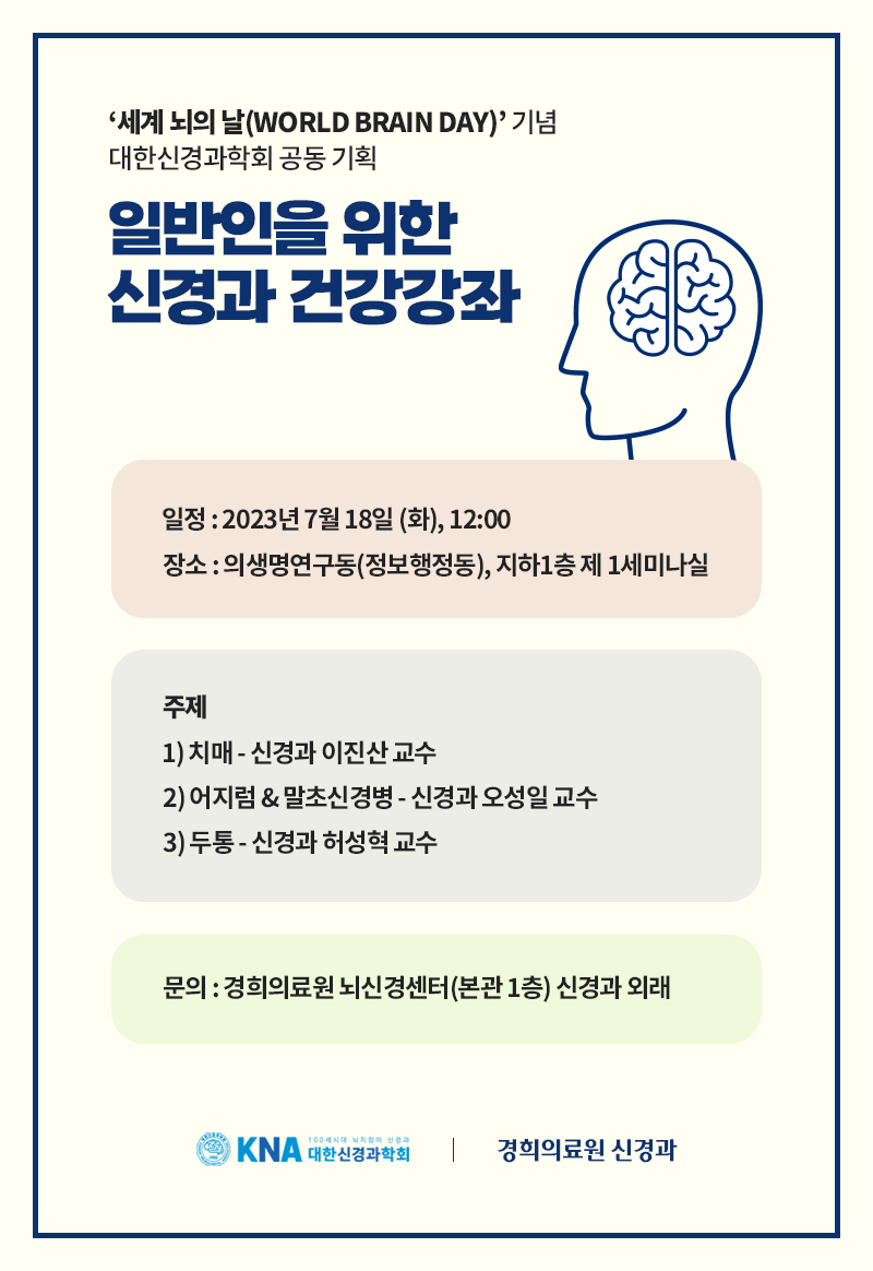 7월 22일 세계 뇌의 날을 기념해 대한신경과학회와 공동 기획한 이번 강좌는 ▲치매(신경과 이진산 교수) ▲어지럼&말초신경병(신경과 오성일 교수) ▲두통(신경과 허성혁 교수) 주제로 진행된다.