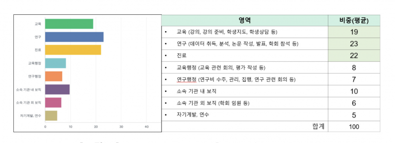 업무 비중은 연구가 23%로 가장 높았으며, 진료(22%), 교육(19%), 소속 기관 보직 관련 업무 비중(10%) 순이었다. 이 외에 교육행정(8%), 소속 기관 외 보직(7%), 학생지도(6%) 등도 포함된다.