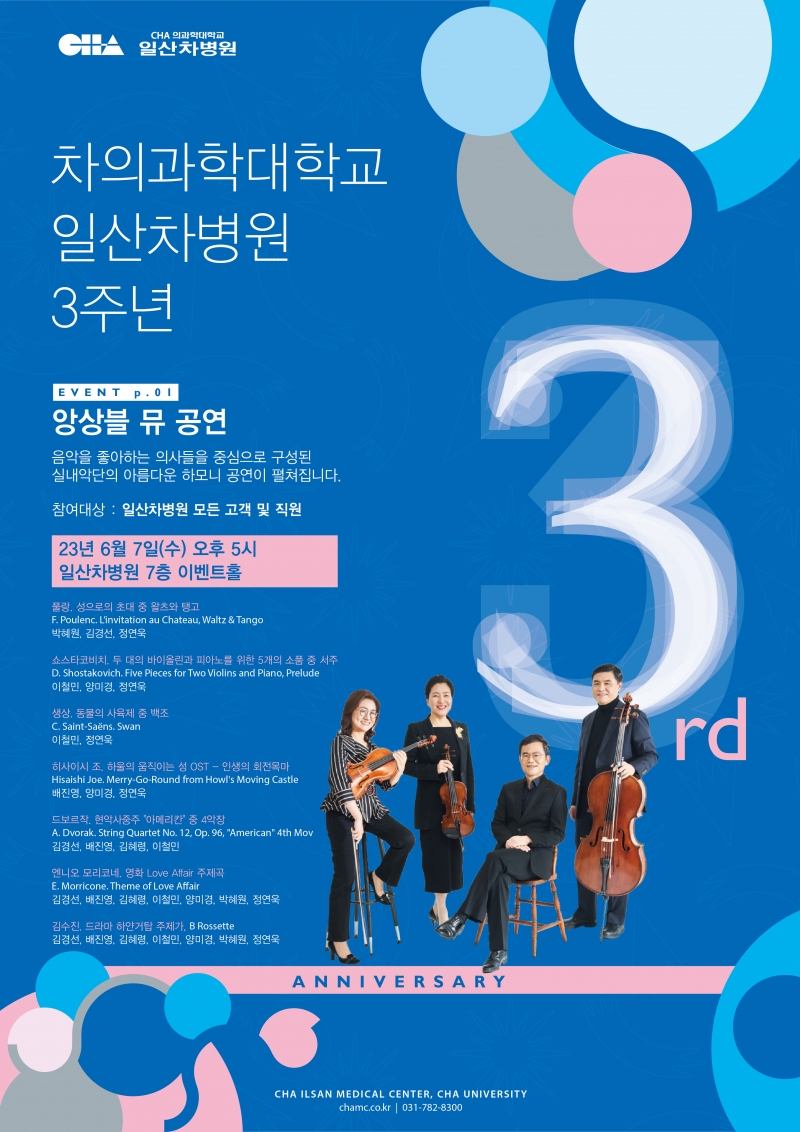 이번 음악회는 일산차병원 부인종양센터 이철민 교수를 비롯해 의사 중심으로 구성된 실내 악단 ‘뮤 앙상블’이 공연을 진행한다.