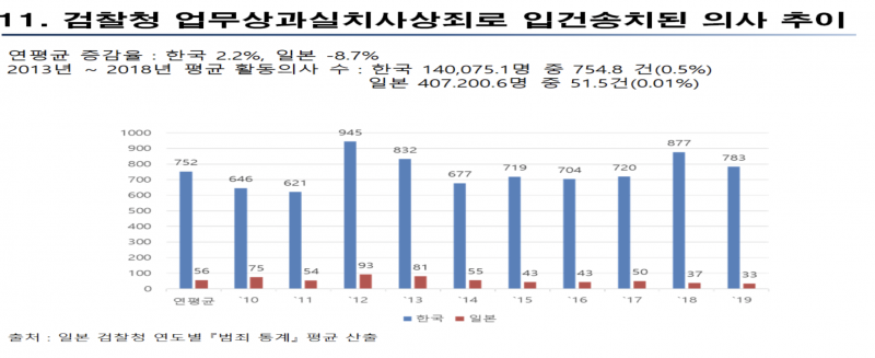연구원은 "일본의 2011~2015년 업무상과실치사상죄로 의사가 기소되는 평균 기소율은 6.5%에 불과하다"며 "동일 기준을 적용 시 한국은 38배 높으며, 한국 검찰 통계 적용 시 격차는 265배까지 확대된다"고 설명했다.