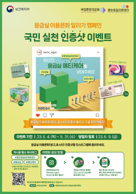이벤트는 중앙응급의료센터 인스타그램(@nemc_egen)을 통해 참여할 수 있으며, 무작위 추첨을 통해 참여자 중 126명에게 신세계 상품권과 응급실 이용문화 큐브 등이 수여된다.