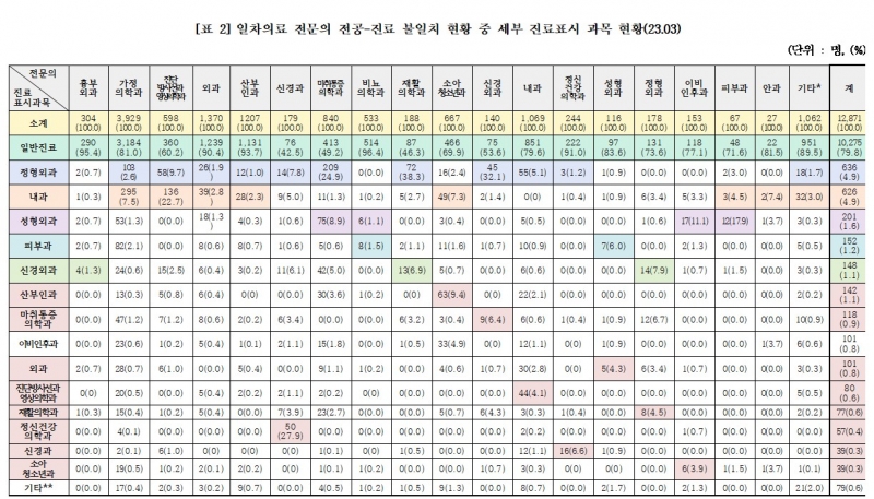 세부 진료표시 과목을 살펴본 결과, 불일치 전문의 12,871명 중 79.8%(1만275명)가 일반진료를 하는 것으로 확인됐다.