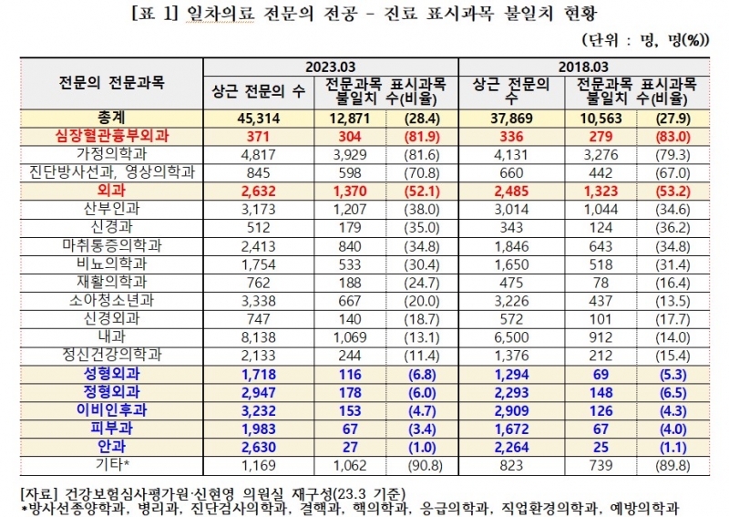 자료를 살펴보면, 3월 기준 일차의료 상근 전문의 4만5314명 중 28.4%(1만2871명)는 전공과 진료 표시과목이 일치하지 않았다. 5년 전(前) 1만563명보다 2218명 증가한 수치다.