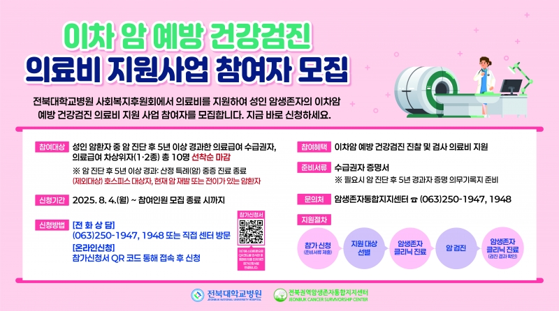 양종철 병원장은 “암 치료 이후에도 꾸준한 건강관리가 필요하며 이차암 발생을 조기 예방하는 것이 중요하다. 지역의 의료취약계층 암 생존자들에게 실질적인 건강 회복의 기회가 되길 바란다”고 전했다.