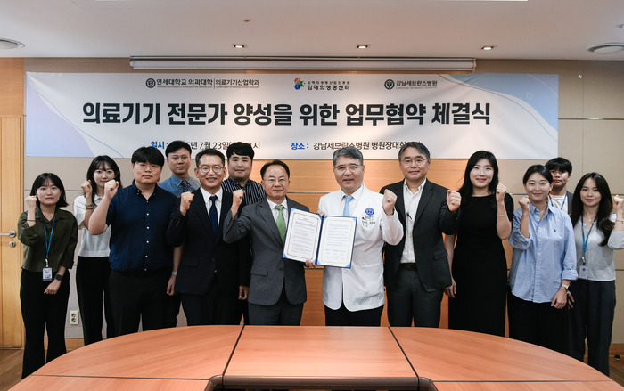 강남세브란스병원(병원장 구성욱)과 연세의대 의료기기산업학과가 지난 23일 김해의생명산업진흥원과 의료기기 전문가 양성을 위한 업무협약을 맺었다.
