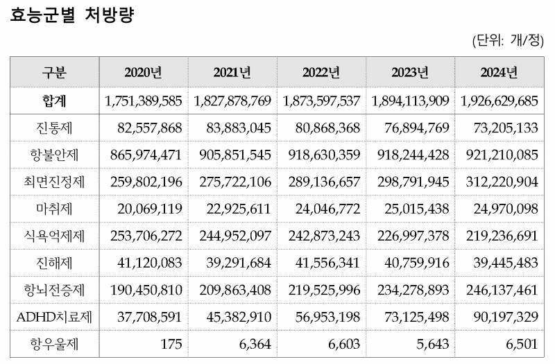 특히 처방량이 급격히 증가한 효능군은 ADHD 치료제로, 최근 5년간 처방량이 매년 20% 이상 크게 증가한 것으로 나타났다. 2020년 3771만개에서 2024년 9020만개로 늘었다.