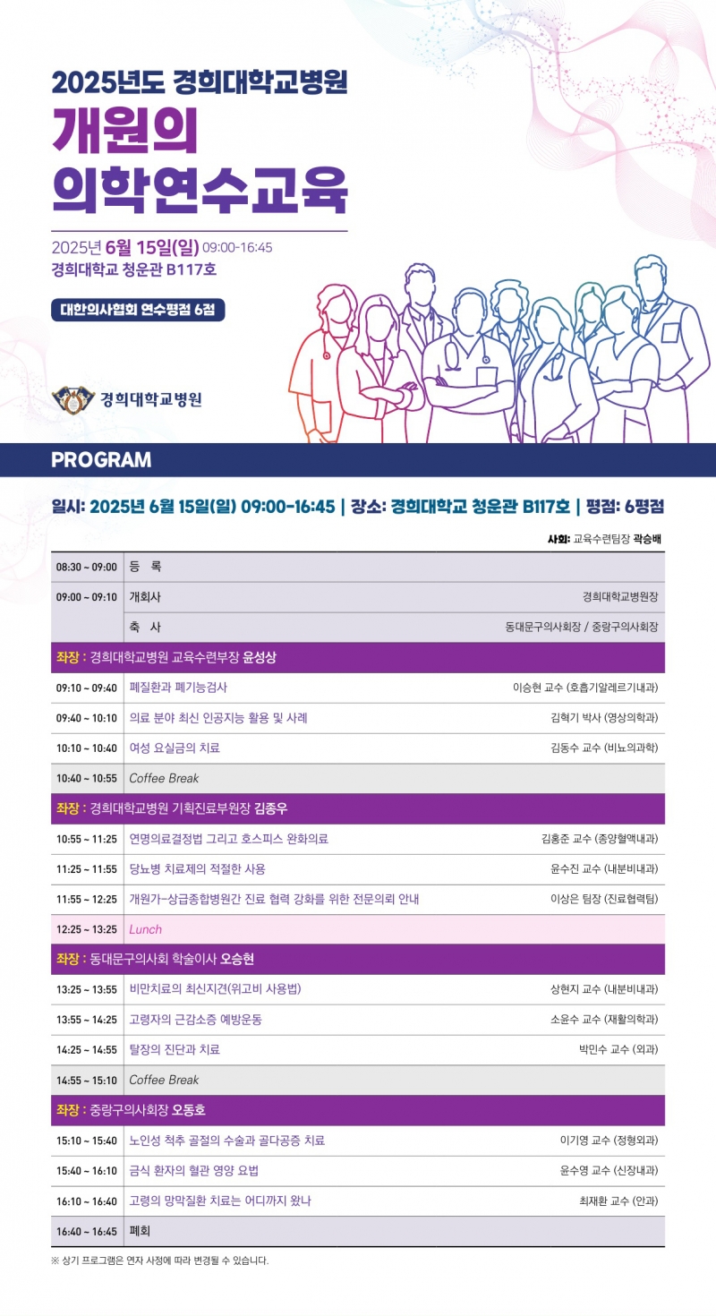 경희대학교병원(병원장 오주형)은 오는 15일 경희대학교 청운관에서 ‘2025 개원의 의학연수교육’을 개최한다고 9일 밝혔다.
