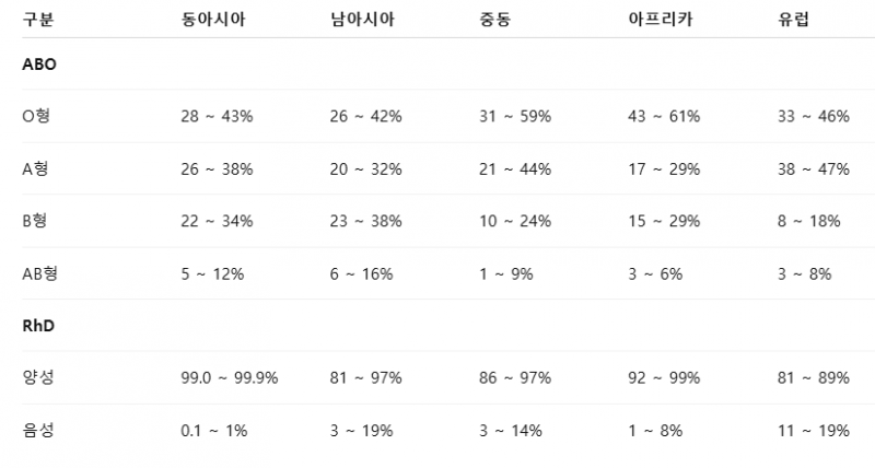 연구에 따르면 한국, 일본, 중국, 대만 등을 포함한 동아시아는 유럽, 중동, 아프리카 지역과 달리 AB형의 비율은 상대적으로 높지만 RhD 음성은 극히 낮았다.