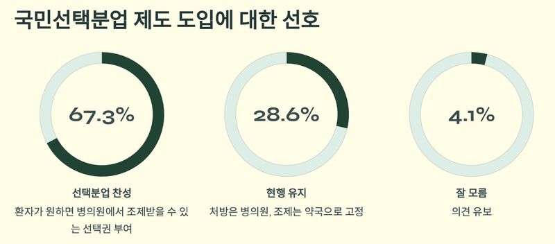 이러한 경향은 지역·소득 수준에 관계없이 광범위하게 나타났으며, 특히 거동이 불편한 고령층일수록 선택분업 도입 찬성 비율이 높게 관찰됐다.