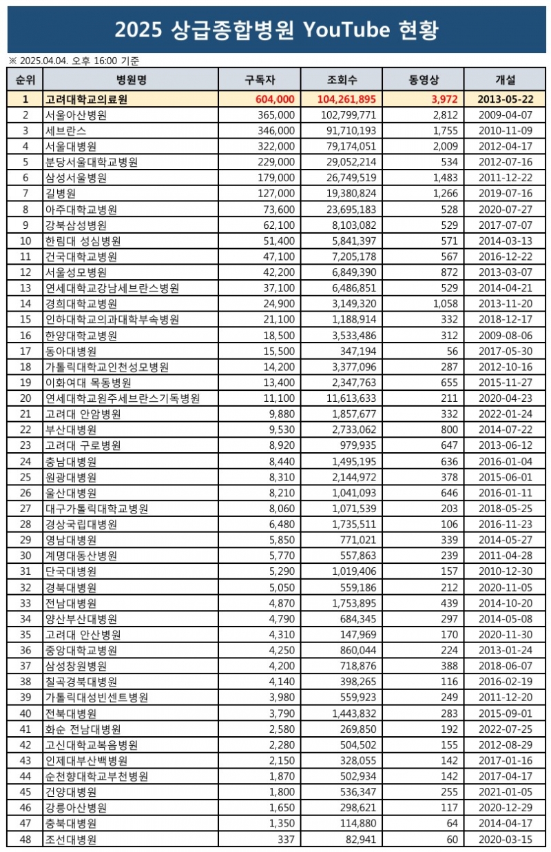 고려대학교의료원 구독자수는 60만4000명으로, 2위 서울아산병원(36만5000명), 3위 세브란스병원(34만6000명), 4위 서울대병원(32만2000명)과 큰 격차를 보였다.