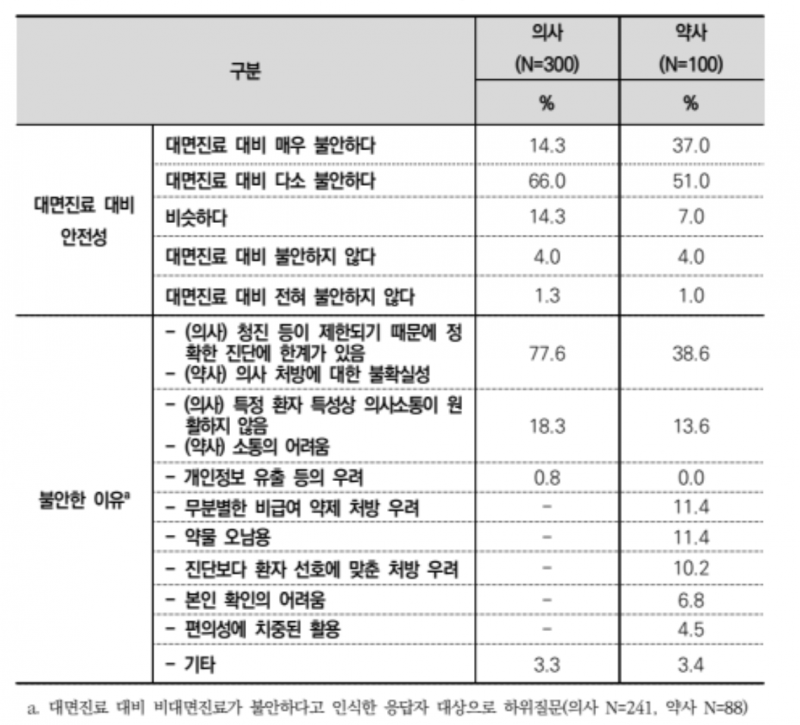 다만 의사(80.3%)와 약사(88%) 모두 진단 정확성 등을 이유로 대면진료 대비 비대면 진료가 불안하다고 응답했다.