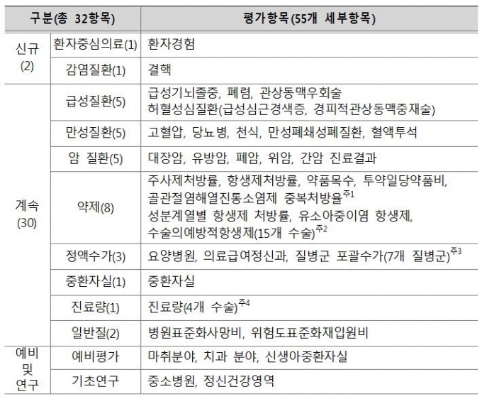 그간 진행했던 급성기뇌졸중, 고혈압, 당뇨병, 고혈압, 당뇨병, 주사제처방률, 중환자실 등 평가를 포함하면 총 32항목이 대상이 된다.