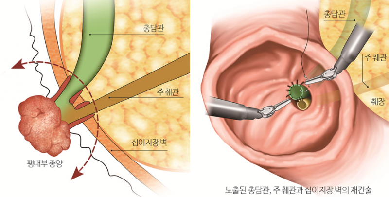 담도와 췌장관이 십이지장으로 유입되는 팽대부에 진행성 암이 생기면 췌장 머리부분을 절제하는 십이지장절제술(휘플수술)을 시행해햐 한다.