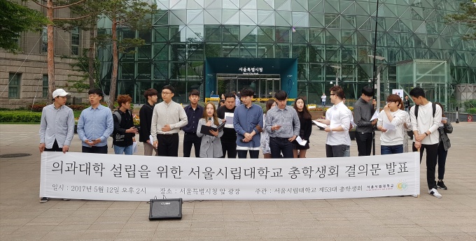 서울시립대학교 총학생회는 11일 서울시청 광장에서 “설문조사, 공청회 등을 통해 학교의 발전을 바라는 학우들의 목소리를 들었다”며 결의문을 발표했다.