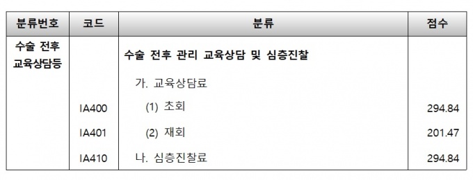 교육상담료와 마찬가지로 기관별 1일 최대 4명, 15분 이상 상담을 진행해야 하며 환자 본인부담률 20%가 적용된다. 다른 점은 진찰료 별도 산정이 불가능하고 수술 전에만 상담을 인정한다는 것이다.