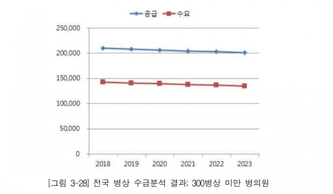즉, 의료기관 유형 중 300병상 이상 종합병원과 재활병상의 경우 부족했고 300병상 미만 병의원과 요양병상의 경우에는 과잉공급으로 예측됐다. 전체적으로 24만개의 병상이 과잉공급될 것으로 추계됐다.