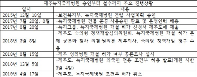 이후 원희룡 제주지사는 그해 12월 공론위 결정을 존중할 것이라는 기존 입장을 번복해 녹지국제병원 외국인을 대상으로 한 조건부 허가 결정을 내렸고, 이마저도 금년 4월에는 조건부 허가 취소 결정을 내린 바 있다.
