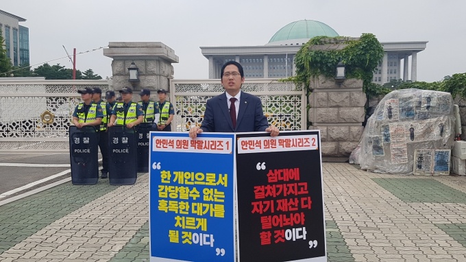 최대집 의협 회장은 19일 국회 정문에서 경기도 오산 소재 정신과 전문병원급 의료기관 개설 과정에서 의사에게 막말을 한 것으로 알려진 안민석 의원의 사퇴를 촉구하는 1인 시위를 개최했다.