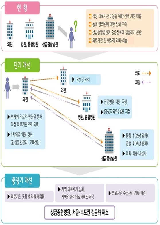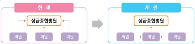 현재는 환자가 병·의원에 진료의뢰서를 요구, 발급받아 선택적으로 상급종합병원에 가는 구조로 돼 있어 의뢰 필요성이 낮은 경증환자도 상급종합병원을 쉽게 이용하고 있다. 이를 개선, 병·의원 의사가 필요성이 있다고 판단할 때만 적절한 의료기관으로 직접 진료를 연계해주는 체계로 의뢰절차를 강화할 방침이다.