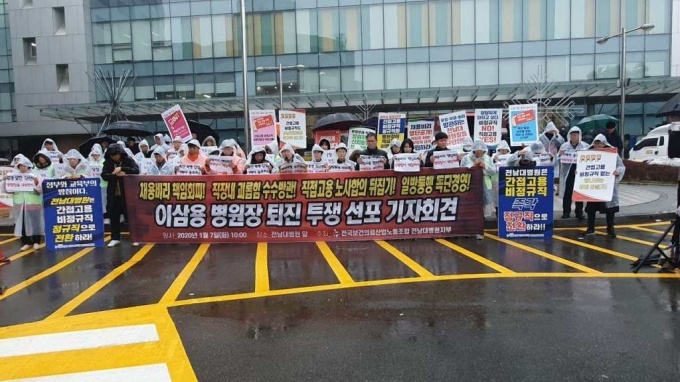 7일 민주노총 전국보건의료산업노동조합 전남대병원지부는 병원 앞에서 기자회견을 개최하고 "최근 채용비리 관련 교육부 특별감사 결과 채용비리가 사실임이 밝혀져 교육부는 전(前) 사무국장 중징계, 그 아들과 여자친구에 대해 채용 취소 처분을 내렸다"고 밝혔다.