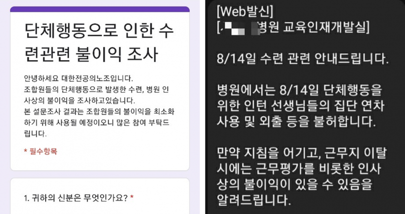 실제 지난 8월14일 전국의사 총파업 궐기대회를 앞두고 일부 국립대병원들에서는 전공의와 인턴들에게 단체행동 참여시 인사상 불이익을 줄 수 있다는 경고를 담은 문자 메시지를 발송한 바 있다.