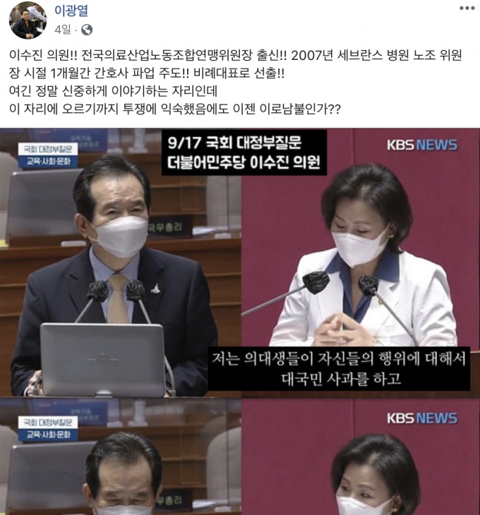 이광열 서울시의사회 정책이사는 지난 18일 페이스북에 글을 올려 “의료에 대한 기본 틀을 이해하지 못한 것”이라고 비판했다.