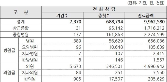 의료기관 종별로는 상급종합병원 31개소·9만5142건·진찰료 17억1621만원, 종합병원 177개소·16만1863건·22억7460만원 등으로 집계됐다. 상급종합병원과 종합병원 등에서 전체 전화상담의 37%가 시행된 셈이다.
