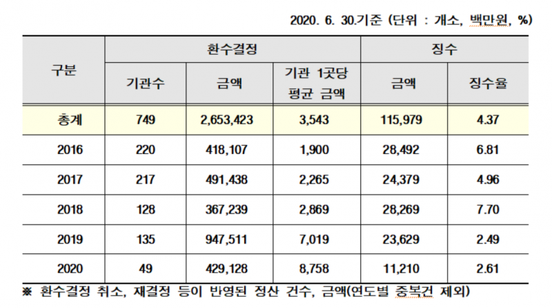 2016년에는 약 284억원으로 환수결정액 대비 6.81%까지 징수했지만, 지난해와 올해는 겨우 2%대 징수율에 그쳤다.