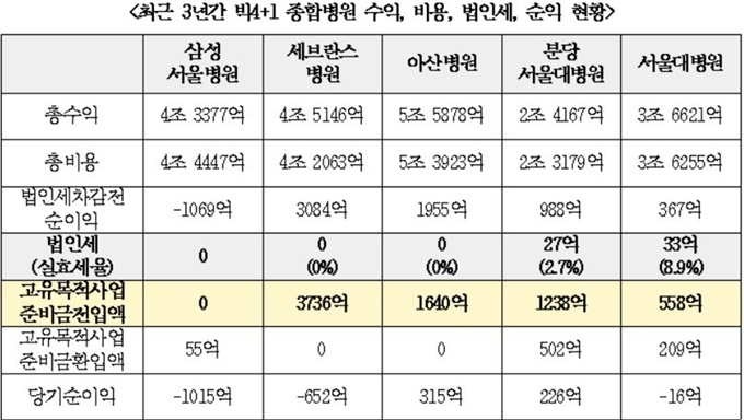 고 의원에 따르면 신촌세브란스병원은 최근 3년 동안 3084억원의 법인세 차감 전에 순이익을 올렸지만, 이보다 많은 3736억원을 고유목적사업준비금으로 설정했다. 서울아산병원도 1955억원의 순이익을 달성했으나 1640억원을 고유목적사업준비금으로 처리했는데, 양 병원이 납부한 법인세는 모두 ‘0원’이다.