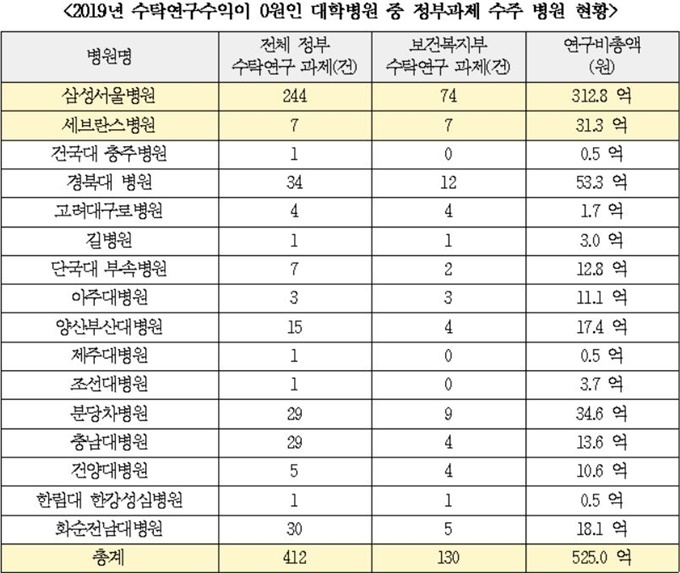 지난해 국가연구용역과제 현황에 따르면 수탁연구과제 수익이 0원인 대학병원들이 총 412건의 과제를 위탁 받은 것으로 나타났다. 이중 130건은 보건복지부의 위탁과제였고, 액수로는 525억원에 달한다.