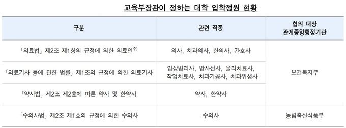 다만 의사·간호사 등 보건의료 분야 직종과 관련한 학과의 경우 모집단위별 정원을 정할 때 관계중앙행정기관인 보건복지부와 협의토록 하고 있다.