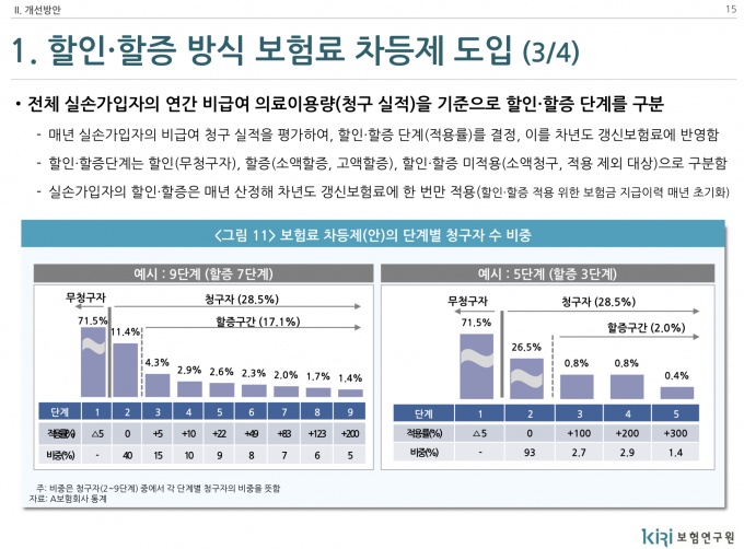 보험연구원은 보험 청구 상위 2%에 1000300%를 할증하는 방안, 상위 17.1%에 5~200%를 할증하는 방안 두 가지를 제시했다. 이에 따라 현재 단일한 보험료가 향후 각각 5단계, 7단계로 구분된다.