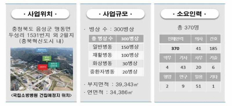 소방청에 따르면 소방전문병원은 21개 진료과목과 300병상을 소유한 연면적 3만2814㎡ 규모의 종합병원으로, 총사업비 1401억원을 들여 오는 2022년 충북도 음성군에 착공을 시작해 2024년 개원할 예정이다.