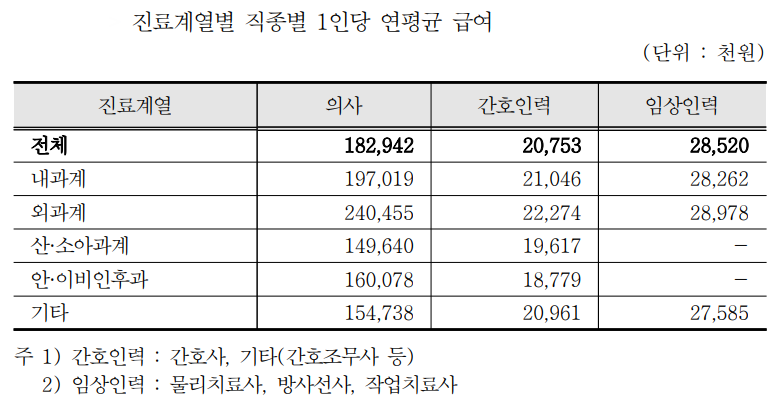 간호인력(간호사 및 간호조무사 등)은 평균 2075만원, 임상인력(물리치료사, 방사선사, 작업치료사)은 평균 2852만원으로 분석됐다.