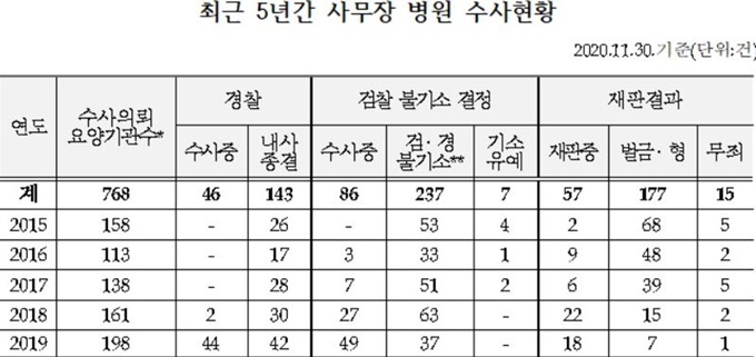 실제로 2015년부터 지난해까지 건보공단이 수사의뢰를 한 사무장병원 등 기관은 768개소였으나, 형이 확정된 곳은 177개소(23%)에 불과했다.