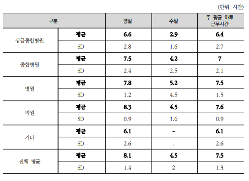 총 1068명을 대상으로 조사가 이뤄졌는데, 이에 따르면 근무시간의 경우 의원급은 평일 8.3시간으로 가장 길고, 상급종합병원의 경우 6.6시간으로 훨씬 짧은 것으로 나타났다.
