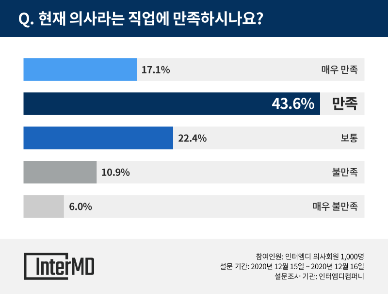 의사 전용 지식·정보 공유 서비스 인터엠디(interMD, www.intermd.co.kr)가 최근 발표한 ‘2020년 대한민국 의사 직업만족도 조사'에 따르면, 대한민국 의사 43.6%가 현 직업에 ‘만족한다’고 응답했으며 ‘매우 만족한다’고 답한 의사는 17.1%로 나타나 총 60.7%가 현재 자신의 직업에 만족한다고 응답했다.