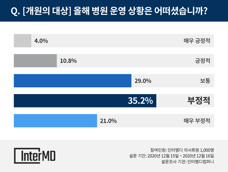 또한 개원의들에게 병원 운영 상황을 물어본 결과, ‘긍정적’이라는 응답이 10.8%로 1년 전 29.2% 대비 크게 하락했으며 ‘부정적’(35.2%), ‘보통’(29.0%), ‘매우 부정적’(21.0%), ‘매우 긍정적’(4.0%) 순으로 나타났다. 역시 코로나19로 인한 환자수 감소에 크게 영향을 받은 것으로 보인다.