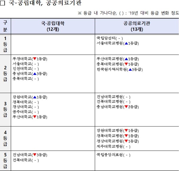 강원대병원, 경북대병원, 경상대병원, 제주대병원 등은 모두 4등급으로 나타났다. 이중 강원대병원, 경북대병원, 경상대병원 등은 2019년 대비 나란히 한 단계씩 하락했고, 동 기간 제주대병원은 등락이 없었다.