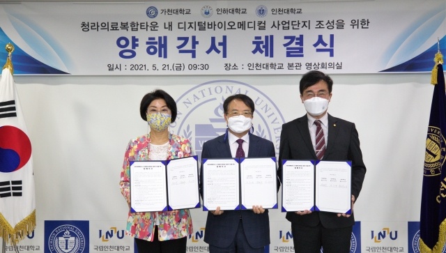 인하대학교는 21일 송도국제도시 내 인천대 캠퍼스에서 인천대학교, 가천대학교와 '청라의료복합타운 내 디지털바이오메디컬 사업단지 조성을 위한 양해각서(MOU)'를 체결했다고 밝혔다.