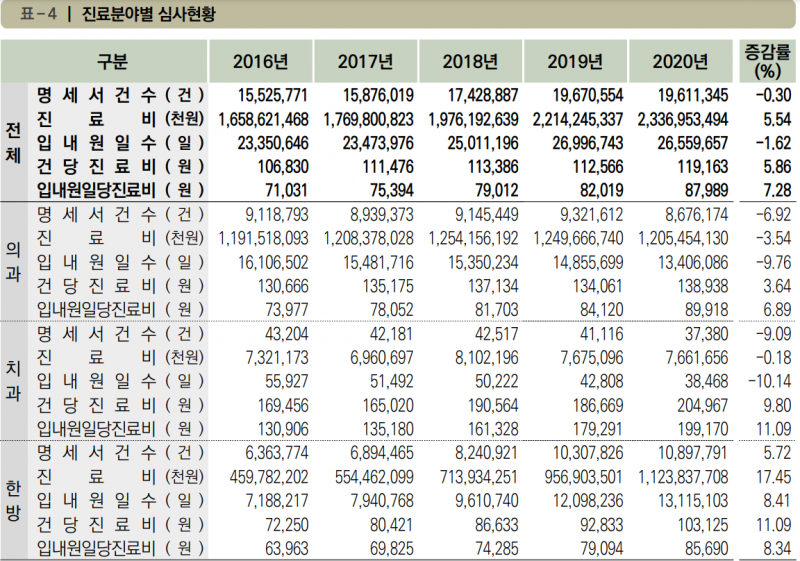 세부적으로 보면 의과는 명세서 건수와 진료비, 입내원일수 모두 줄었다. 치과 분야도 같은 분야가 모두 전년 대비 감소했다.