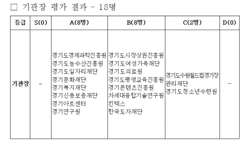 18명의 출자·출연기관장 평가결과, 경기도의료원장은 B등급을 받았다. B등급 이상인 기관과 기관장은 도(道)와 협의해 예산 범위 내에서 성과급을 지급받을 수 있다.