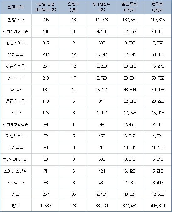 진료과별 현황으로는 한방내과 705일(1인당 평균 내원일수), 한방신경정신과 401일, 한방소아과 315일 등으로 집계됐다. 총 진료비는 한방내과 1억6255만9000원, 한방신경정신과6725만7000원, 한방소아과 880만5000원 등이었다.