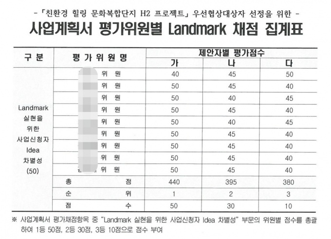 현재 의혹이 강하게 지적되는 지점은 9명 심사위원 중 8명이 명지병원·롯데건설에 만점을 부여한 대목이다. 이는 40점과 45점, 50점이 고르게 분포된 다른 컨소시엄과 비교된다는 것이다.