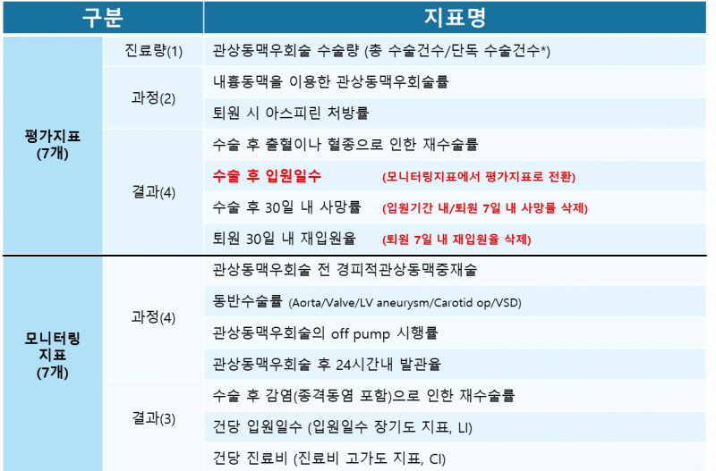 지난 평가와 달라진 점은 수술 후 입원일수가 모니터링 지표에서 정식 평가지표로 전환됐다는 것이다.
