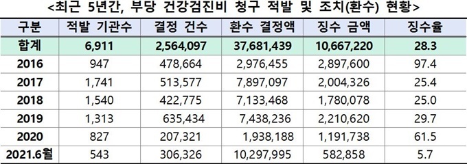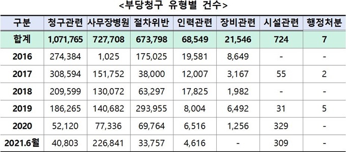 주요 부당 청구 유형은 검진비 청구가 107만1765건으로 가장 높았고, 사무장병원 722만7708건, 절차 위반 67만3798건, 인력 관련 6만8549건, 장비 관련 2만1546건, 시설 관련 724건, 행정처분 7건 등이었다.