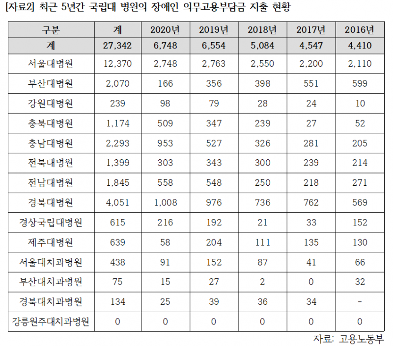 고용노동부로부터 제출받은 ‘국립대병원 장애인 의무고용부담금 지출 현황’에 따르면 ▲2016년 44억1000만원 ▲2017년 45억4700만원 ▲2018년 50억8400만원 ▲2019년 65억5400만원 ▲2020년 67억4800만원 등이다.