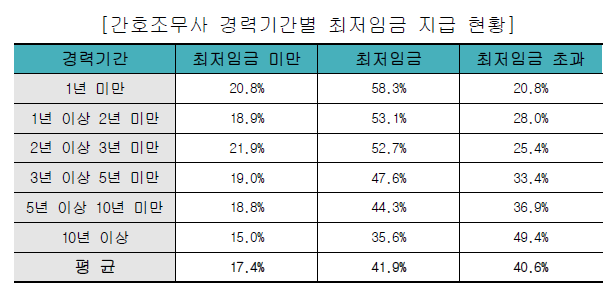 10년 이상 경력을 가진 간호조무사도 예외가 아니었다. 이들 중 최저임금보다 더 많은 급여를 받는 이는 49.4%로 절반 수준이었다. 최저임금 수령 비율은 35.6%, 최저임금 미만으로 받는 경우는 15% 등으로 조사됐다.