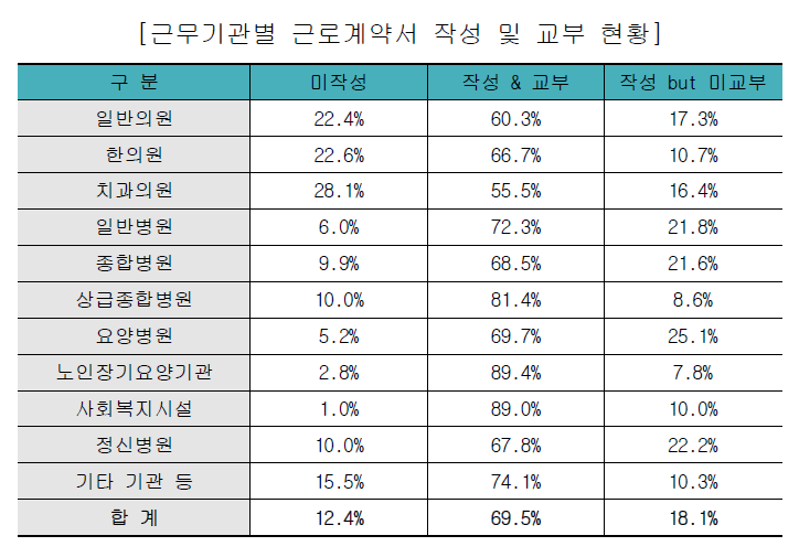 근로계약서 작성과 교부를 모두 준수한 곳은 ▲노인장기요양기관 89.4% ▲사회복지기관 89% ▲상급종합병원 81.4% ▲일반병원 72.3% ▲요양병원 69.7% 등의 순이었으며, 미작성 경우는 ▲치과의원 28.1% ▲한의원 22.6% ▲일반의원 22.4% 등 의원급이 가장 높았다.