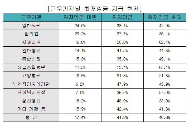 근무기관별로 살펴보면, 한의원의 최저임금 미만 지급율이 26.2%로 가장 높았다. 이어 일반의원 24.0%, 정신병원 18.2%, 치과의원 16.8%, 일반병원 14.1%, 종합병원 15.3%, 상급종합병원 11.5% 순으로 나타났다.